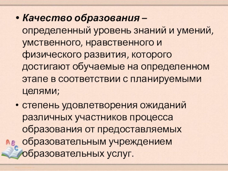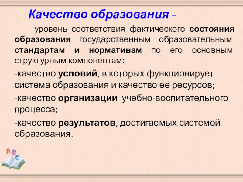 Слайд 18Качество образования – определенный уровень знаний и умений, умственного, нравственного и