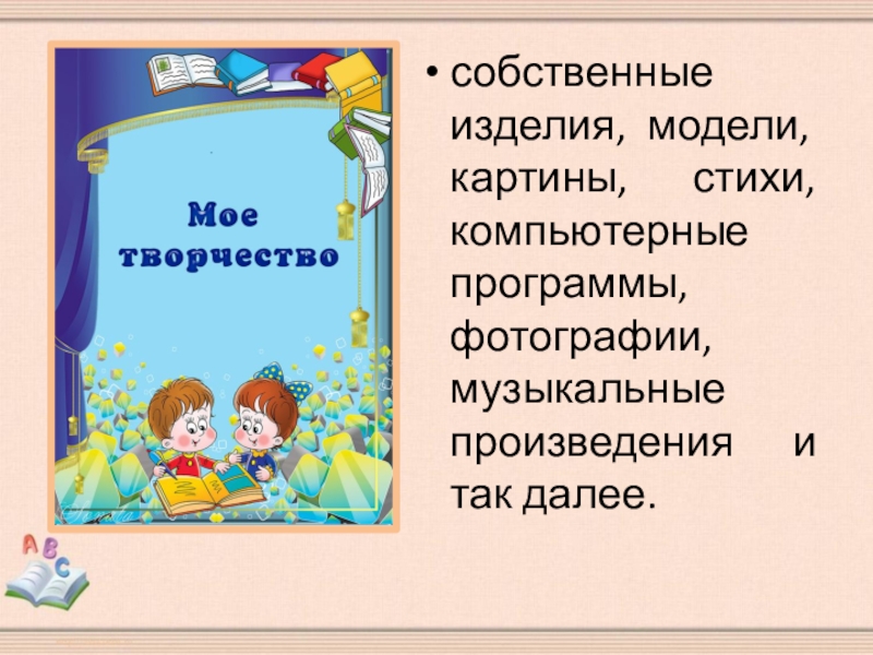 Слайд 104собственные изделия, модели, картины, стихи, компьютерные программы, фотографии, музыкальные произведения и