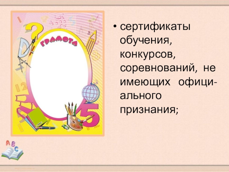 Слайд 103сертификаты обучения, конкурсов, соревнований, не имеющих офици-ального признания;