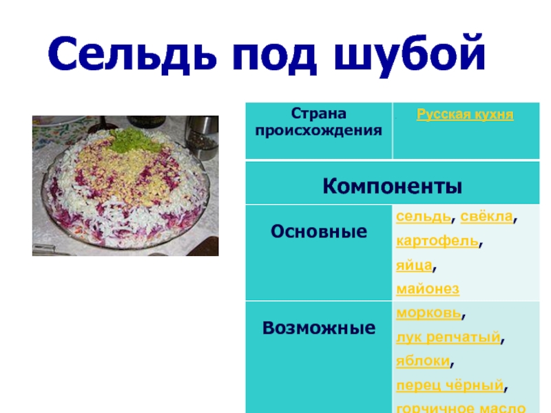«Сельдь под шу́бой» («селёдка под шубой» или просто «шуба») — популярный в России«Сельдь под шу́бой» («селёдка под шубой» или просто «шуба») — популярный в России и странахбывшего СССР«Сельдь под шу́бой» («селёдка под шубой» или просто «шуба») — популярный в России и странахбывшего СССР салат«Сельдь под шу́бой» («селёдка под шубой» или просто «шуба») — популярный в России и странахбывшего СССР салат из сельди«Сельдь под шу́бой» («селёдка под шубой» или просто «шуба») — популярный в России и странахбывшего СССР салат из сельди и овощей. Примерно с середины 1970-х годов этот салат стал традиционным блюдом для праздничного и новогоднего стола.