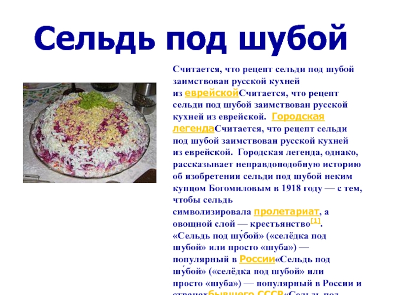 из еврейскойСчитается, что рецепт сельди под шубой заимствован русской кухней из еврейской. Городская легендаСчитается, что рецепт сельди под шубой заимствован русской кухней из еврейской. Городская легенда, однако, рассказывает неправдоподобную историю об изобретении сельди под шубой неким купцом Богомиловым в 1918 году — с тем, чтобы сельдь символизировала пролетариат, а овощной слой — крестьянство[1].