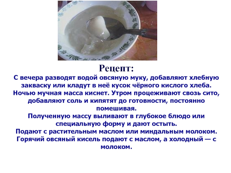 Горячий овсяный кисель подают с маслом, а холодный — с молоком.