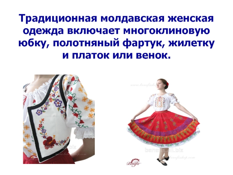 Слайд 5Традиционная молдавская женская одежда включает многоклиновую юбку, полотняный фартук, жилетку и