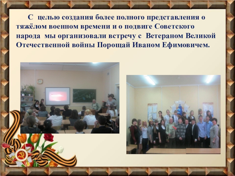 о подвиге Советского народа мы организовали встречу с Ветераном Великой Отечественной войны Порощай Иваном Ефимовичем.