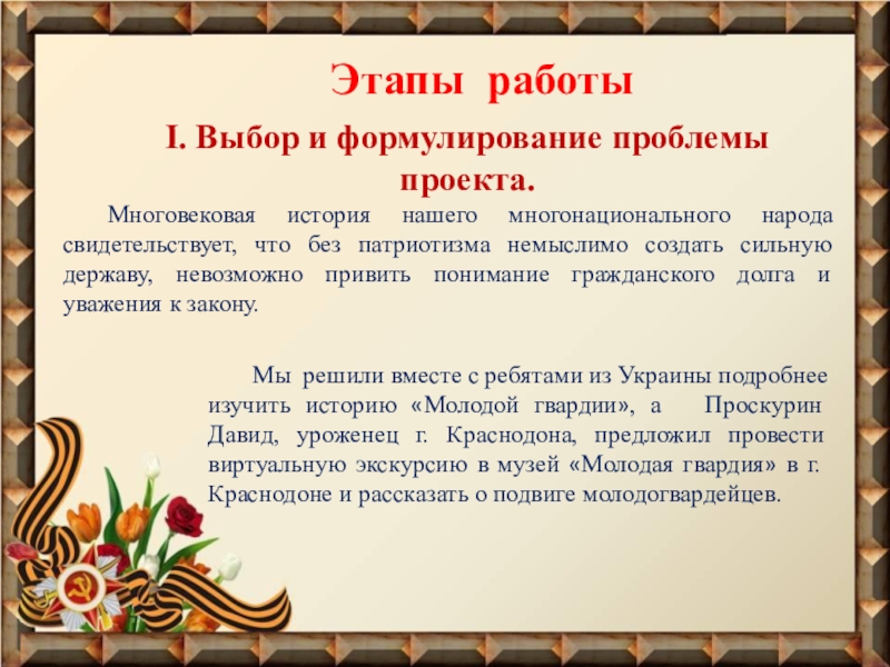 Мы решили вместе с ребятами из Украины подробнее изучить историю «Молодой гвардии», а Проскурин Давид, уроженец г. Краснодона, предложил провести виртуальную экскурсию в музей «Молодая гвардия» в г. Краснодоне и рассказать о подвиге молодогвардейцев.