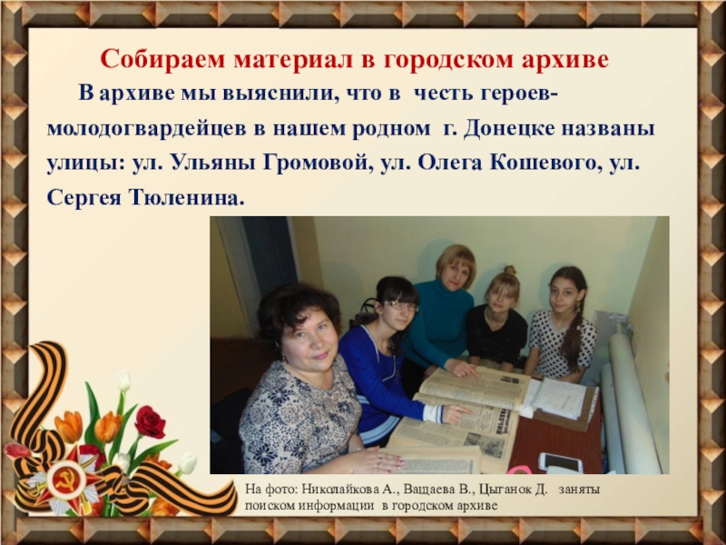 В архиве мы выяснили, что в честь героев-молодогвардейцев в нашем родном г. Донецке названы улицы: ул. Ульяны Громовой, ул. Олега Кошевого, ул. Сергея Тюленина.