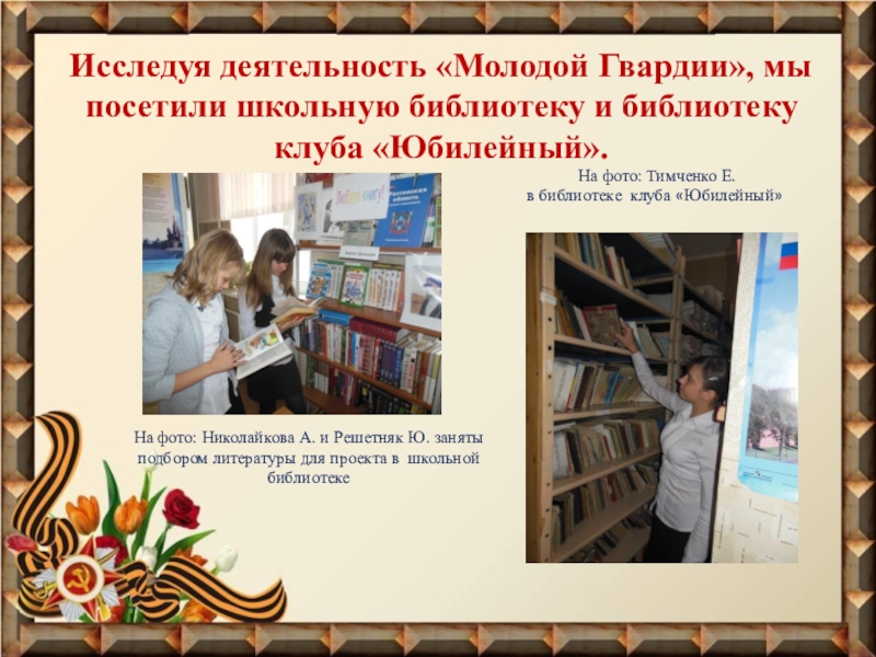 Исследуя деятельность «Молодой Гвардии», мы посетили школьную библиотеку и библиотеку клуба «Юбилейный».