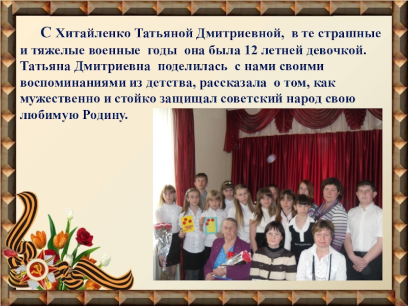 Слайд 15 С Хитайленко Татьяной Дмитриевной, в те страшные и тяжелые военные