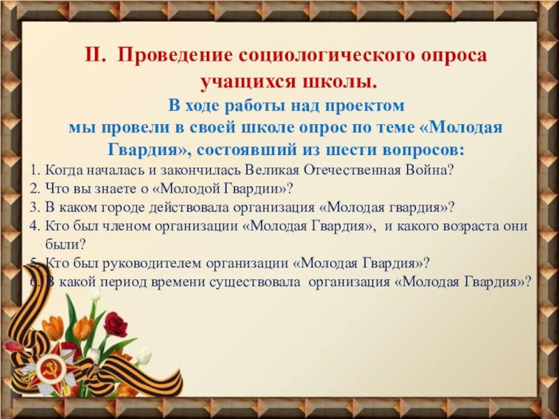 мы провели в своей школе опрос по теме «Молодая Гвардия», состоявший из шести вопросов: