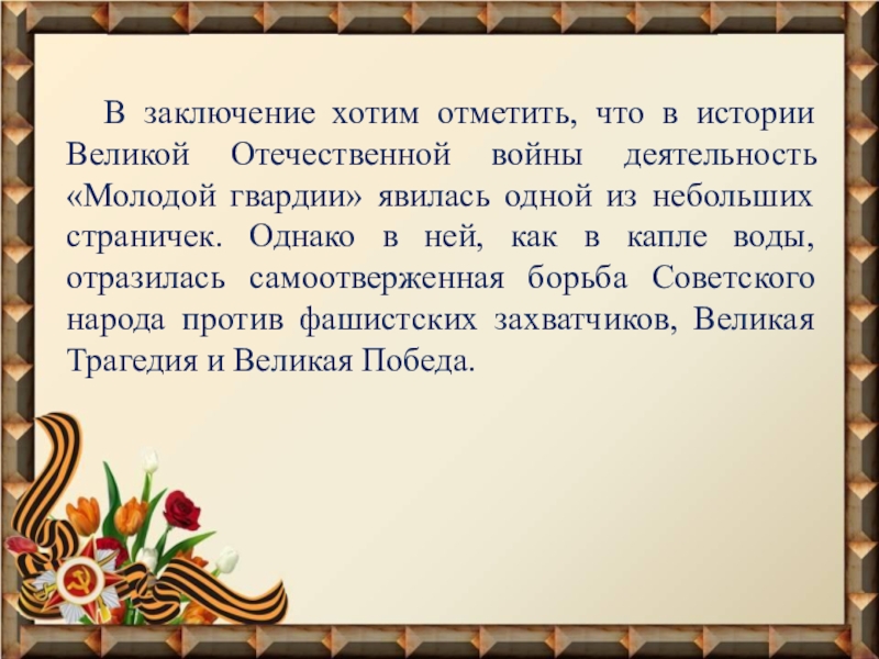 «Молодой гвардии» явилась одной из небольших страничек. Однако в ней, как в капле воды, отразилась самоотверженная борьба Советского народа против фашистских захватчиков, Великая Трагедия и Великая Победа.