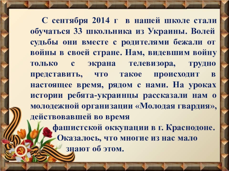 из Украины. Волей судьбы они вместе с родителями бежали от войны в своей стране. Нам, видевшим войну только с экрана телевизора, трудно представить, что такое происходит в настоящее время, рядом с нами. На уроках истории ребята-украинцы рассказали нам о молодежной организации «Молодая гвардия», действовавшей во время