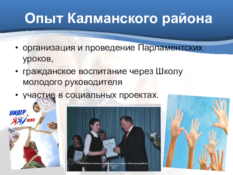 - представить опыт привлечения молодежи к избирательному процессу в Калманском районе.