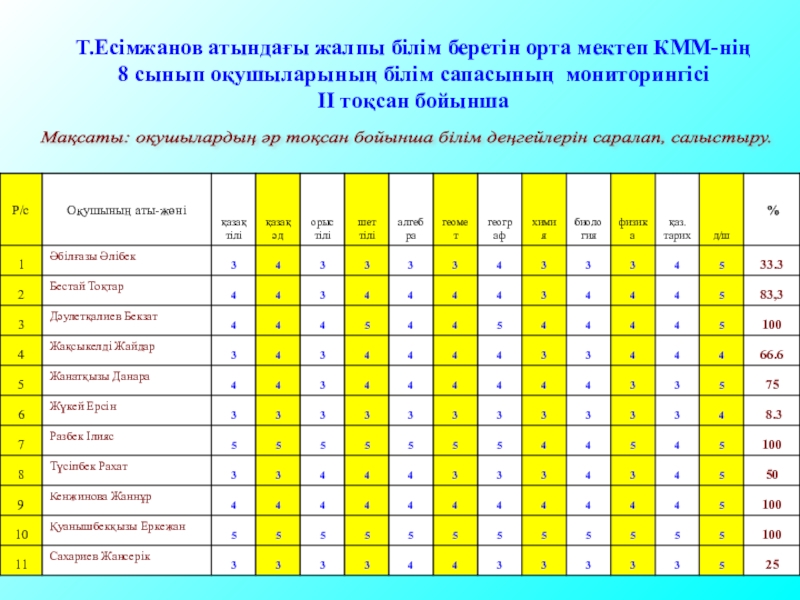 Мақсаты: оқушылардың әр тоқсан бойынша білім деңгейлерін саралап, салыстыру.