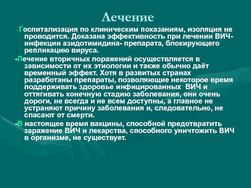 -Лечение вторичных поражений осуществляется в зависимости от их этиологии и также обычно даёт временный эффект. Хотя в развитых странах разработаны препараты, позволяющие некоторое время поддерживать здоровье инфицированных ВИЧ и оттягивать конечную стадию заболевания, они очень дороги, не всегда и не всем доступны, а главное не устраняют причину заболевания и, следовательно, не спасают от смерти.