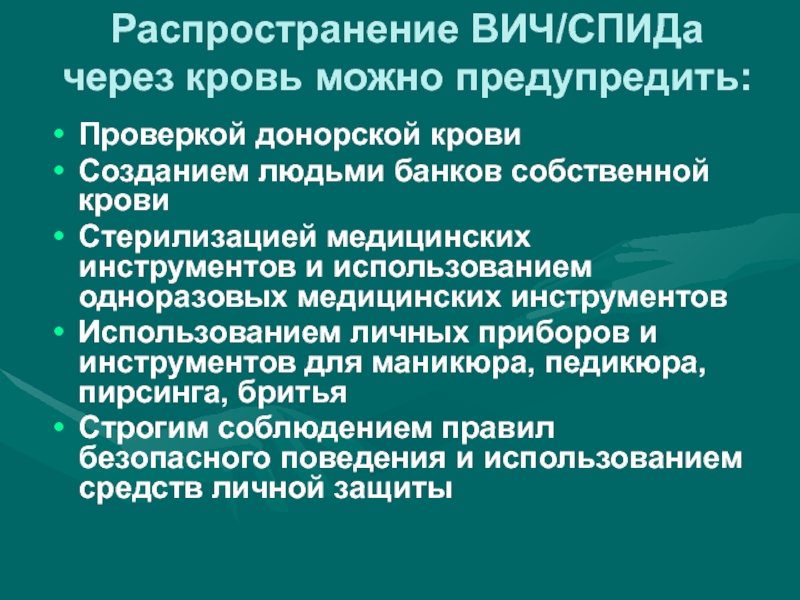 Слайд 17Распространение ВИЧ/СПИДа через кровь можно предупредить: