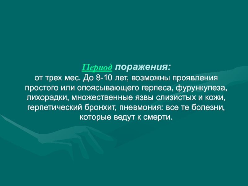 опоясывающего герпеса, фурункулеза, лихорадки, множественные язвы слизистых и кожи, герпетический бронхит, пневмония: все те болезни, которые ведут к смерти.