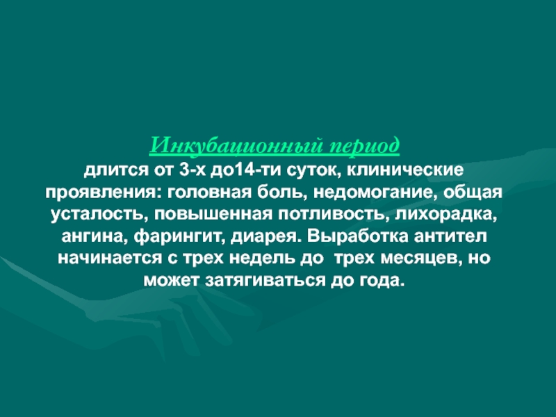 общая усталость, повышенная потливость, лихорадка, ангина, фарингит, диарея. Выработка антител начинается с трех недель до трех месяцев, но может затягиваться до года.