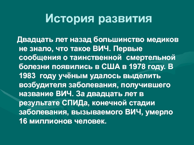 такое ВИЧ. Первые сообщения о таинственной смертельной болезни появились в США в 1978 году. В 1983 году учёным удалось выделить возбудителя заболевания, получившего название ВИЧ. За двадцать лет в результате СПИДа, конечной стадии заболевания, вызываемого ВИЧ, умерло 16 миллионов человек.