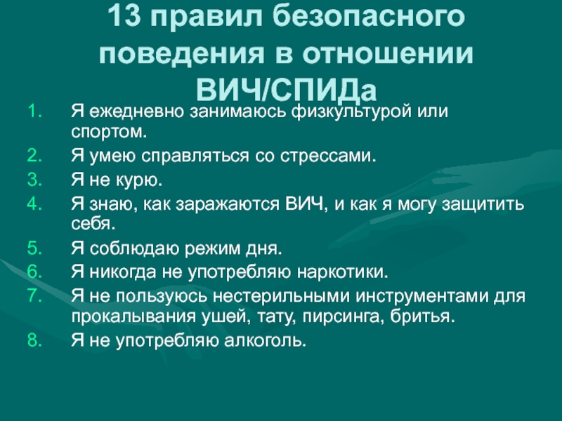 Слайд 1813 правил безопасного поведения в отношении ВИЧ/СПИДа