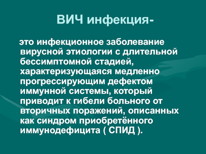 стадией, характеризующаяся медленно прогрессирующим дефектом иммунной системы, который приводит к гибели больного от вторичных поражений, описанных как синдром приобретённого иммунодефицита ( СПИД ).