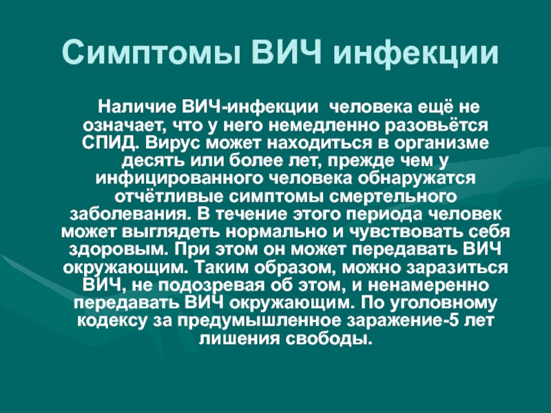 немедленно разовьётся СПИД. Вирус может находиться в организме десять или более лет, прежде чем у инфицированного человека обнаружатся отчётливые симптомы смертельного заболевания. В течение этого периода человек может выглядеть нормально и чувствовать себя здоровым. При этом он может передавать ВИЧ окружающим. Таким образом, можно заразиться ВИЧ, не подозревая об этом, и ненамеренно передавать ВИЧ окружающим. По уголовному кодексу за предумышленное заражение-5 лет лишения свободы.