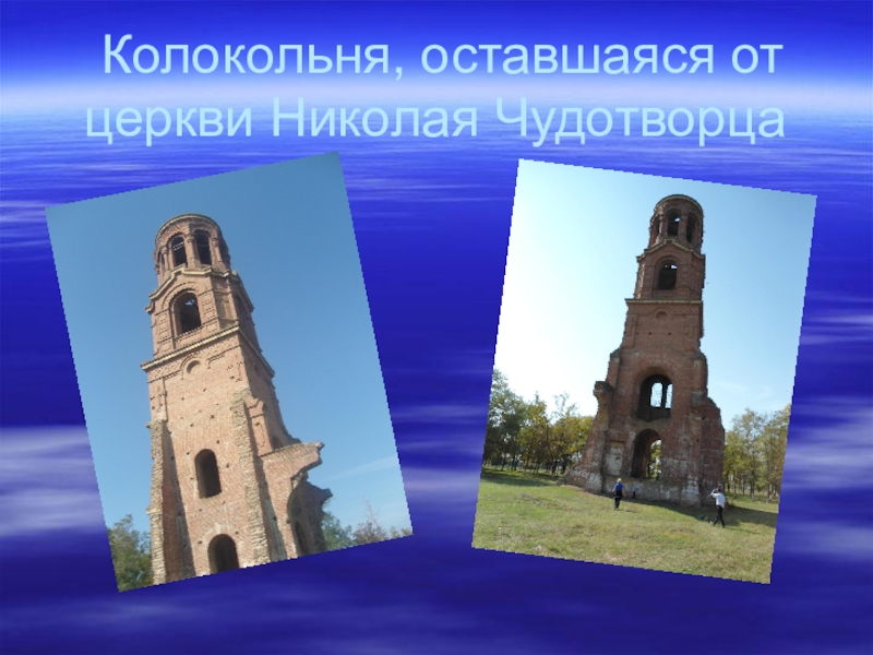 Слайд 8 Колокольня, оставшаяся от церкви Николая Чудотворца