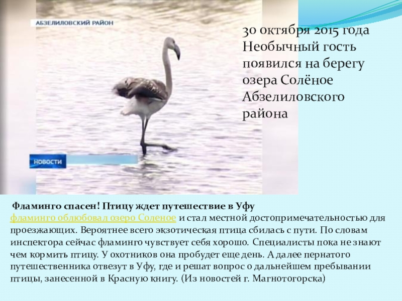 30 октября 2015 года Необычный гость появился на берегу озера Солёное Абзелиловского района
