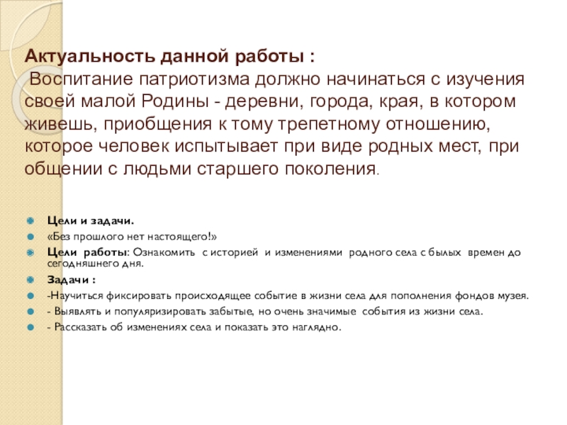 Цели работы: Ознакомить с историей и изменениями родного села с былых времен до сегодняшнего дня.