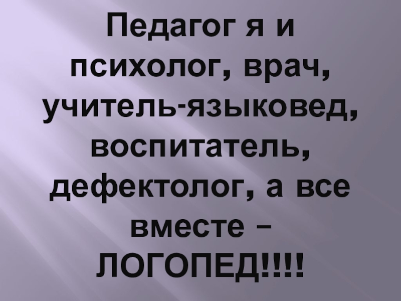 Педагог я и психолог, врач, учитель-языковед, воспитатель, дефектолог, а все вместе – ЛОГОПЕД!!!!