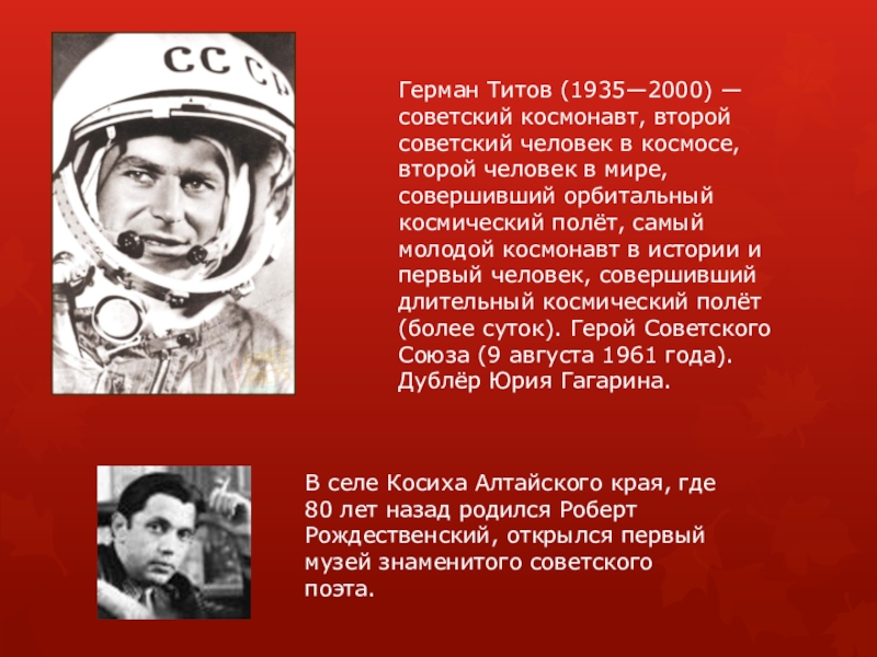 Герман Титов (1935—2000) — советский космонавт, второй советский человек в космосе, второй человек в мире, совершивший орбитальный космический полёт, самый молодой космонавт в истории и первый человек, совершивший длительный космический полёт (более суток). Герой Советского Союза (9 августа 1961 года). Дублёр Юрия Гагарина.