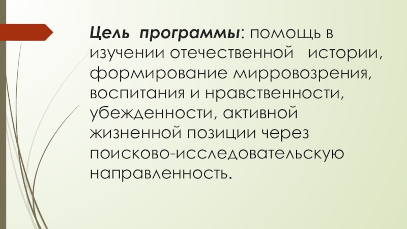 Слайд 6Цель программы: помощь в изучении отечественной истории, формирование мирровозрения, воспитания и