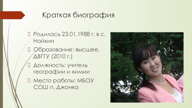 Краткая биографияРодилась 23.01.1988 г. в с. НайхинОбразование: высшее, ДВГГУ (2010 г.)Должность: учитель географии и химииМесто работы: МБОУ