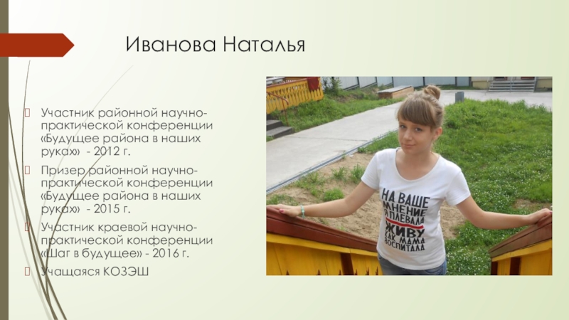 Иванова НатальяУчастник районной научно-практической конференции «Будущее района в наших руках» - 2012 г.Призер районной научно-практической конференции «Будущее