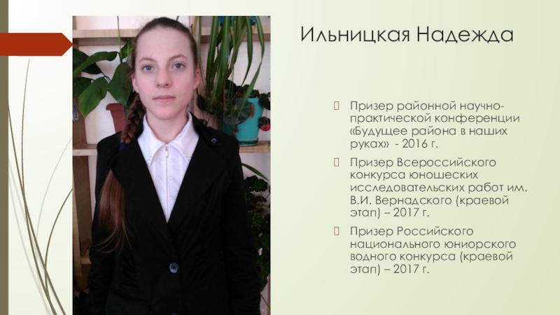 Ильницкая НадеждаПризер районной научно-практической конференции «Будущее района в наших руках» - 2016 г.Призер Всероссийского конкурса юношеских исследовательских
