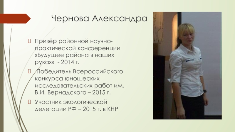 Чернова АлександраПризёр районной научно-практической конференции «Будущее района в наших руках» - 2014 г. Победитель Всероссийского конкурса юношеских