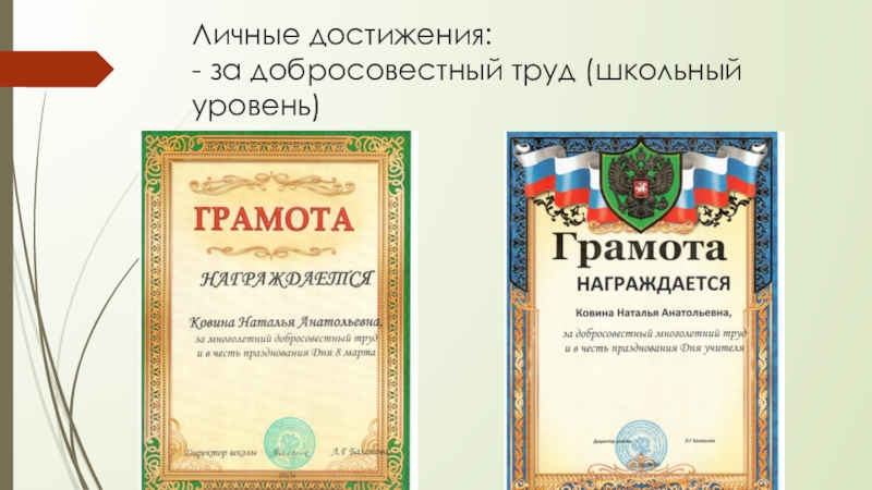 Слайд 14Личные достижения: - за добросовестный труд (школьный уровень)
