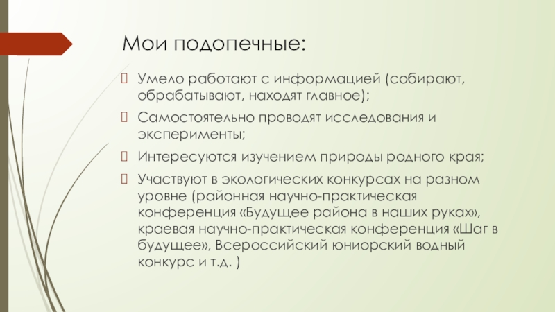 Мои подопечные: Умело работают с информацией (собирают, обрабатывают, находят главное);Самостоятельно проводят исследования и эксперименты;Интересуются изучением природы родного