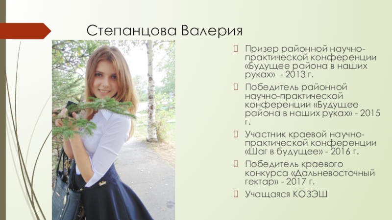 Степанцова Валерия  Призер районной научно-практической конференции «Будущее района в наших руках» - 2013 г.Победитель районной научно-практической