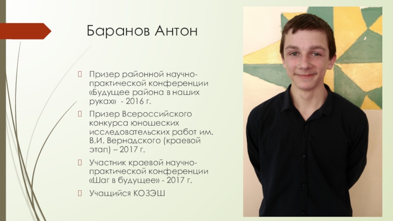 Баранов АнтонПризер районной научно-практической конференции «Будущее района в наших руках» - 2016 г.Призер Всероссийского конкурса юношеских исследовательских