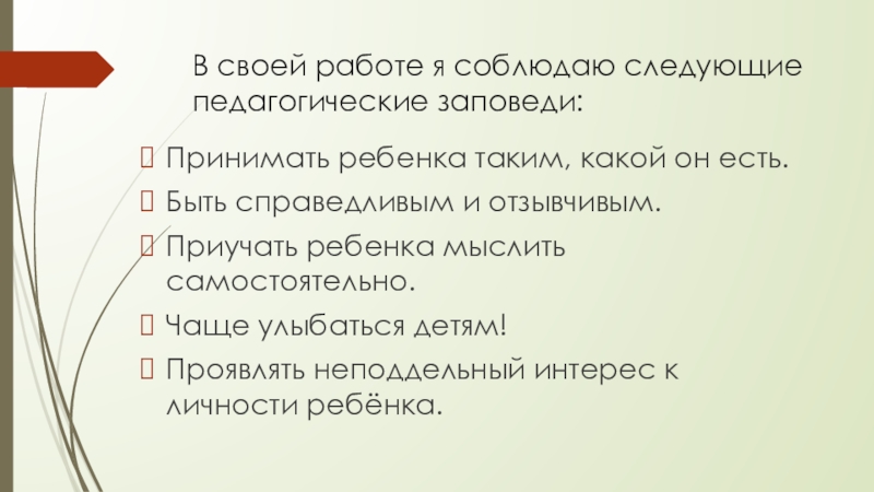 В своей работе я соблюдаю следующие педагогические заповеди: Принимать ребенка таким, какой он есть. Быть справедливым и