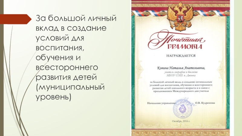 За большой личный вклад в создание условий для воспитания, обучения и всестороннего развития детей (муниципальный уровень)