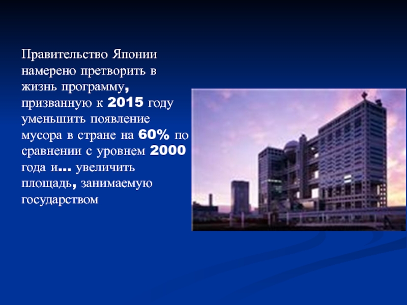 Слайд 4Правительство Японии намерено претворить в жизнь программу, призванную к 2015 году
