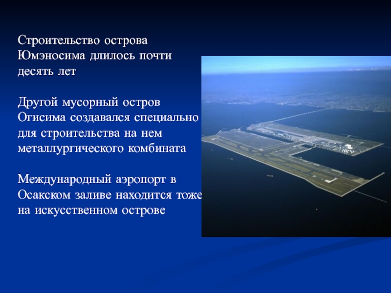 Строительство острова Юмэносима длилось почти десять летДругой мусорный остров Огисима создавался специально для строительства на нем металлургического