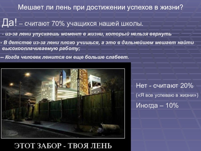 Число учащихся, которым не хватает силы воли в борьбе с ленью, составляет – 40% и занимает четвертое место по школе.