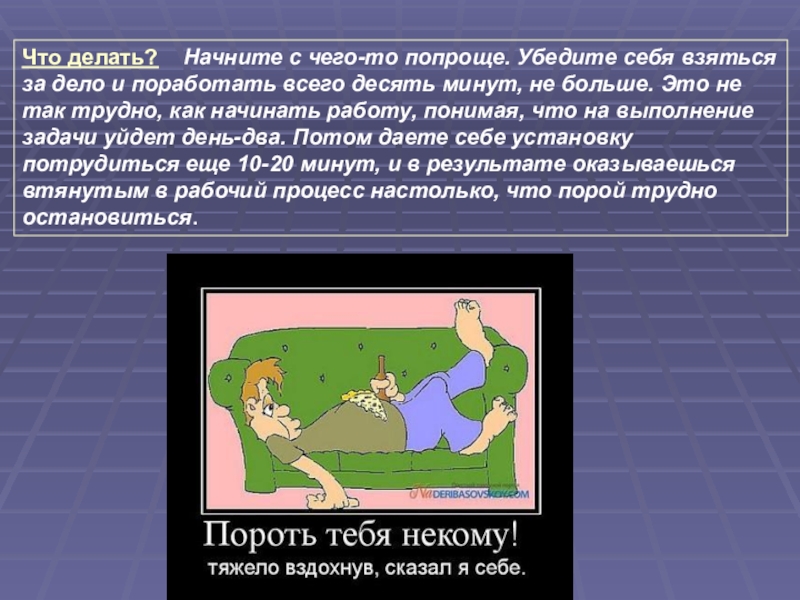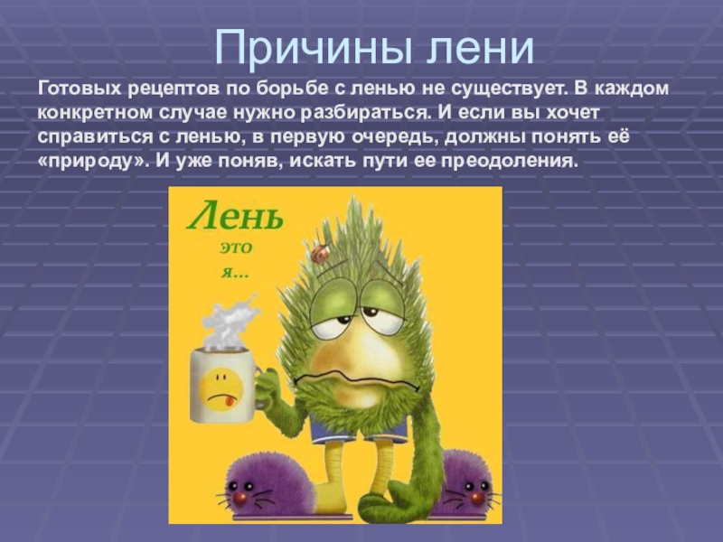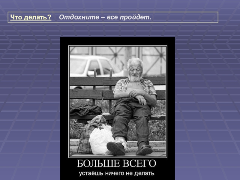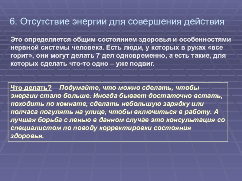 Что делать? Подумайте, что можно сделать, чтобы энергии стало больше. Иногда бывает достаточно встать, походить по комнате, сделать небольшую зарядку или полчаса погулять на улице, чтобы включиться в работу. А лучшая борьба с ленью в данном случае это консультация со специалистом по поводу корректировки состояния здоровья.