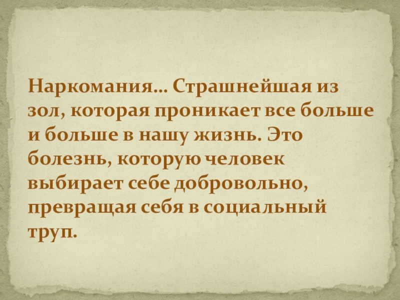 нашу жизнь. Это болезнь, которую человек выбирает себе добровольно, превращая себя в социальный труп.