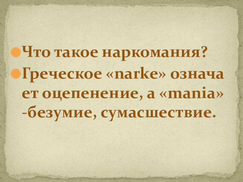 Греческое «narke» означает оцепенение, а «mania»-безумие, сумасшествие.