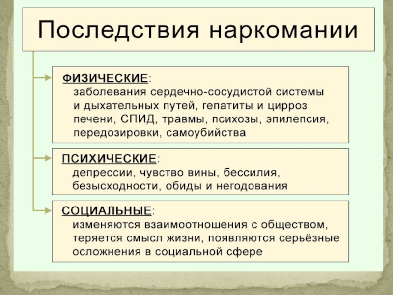 и остаются обычно те люди, у кого недостаток физических, духовных сил для того, чтобы бороться за хорошую жизнь, найти свое место в жизни. Став наркоманом, человек уже не отвечает за свои поступки. Он становится раздражительным ,человек становиться обреченным на постоянное их употребление и короткую жизнь.