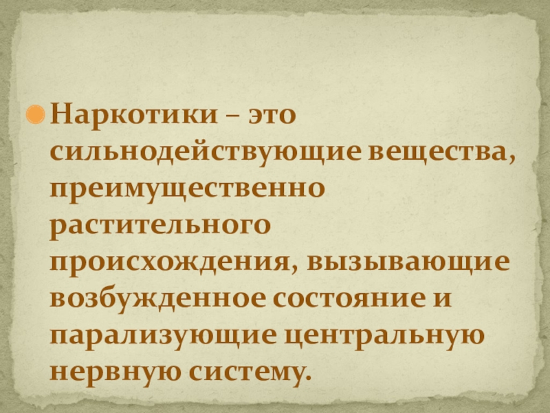Слайд 5Наркотики – это сильнодействующие вещества, преимущественно растительного происхождения, вызывающие возбужденное состояние и парализующие