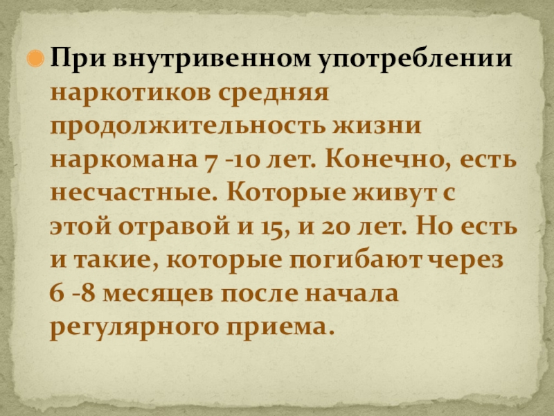 Слайд 13При внутривенном употреблении наркотиков средняя продолжительность жизни наркомана 7 -10 лет.